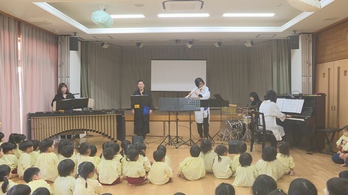 石井手保育園の園児およそ120人を前に、県内外で活動する演奏家のアンサンブルグループ「クレール」とメゾソプラノ歌手の小野朋子さんがパフォーマンスを披露しました。