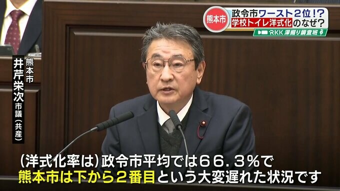 井芹栄次市議(共産)「(洋式化率は)政令市平均では66.3%で、熊本市は下から2番目という大変遅れた状況です。すみやかに洋式化100%を」