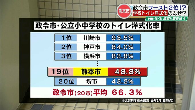 熊本市の教育委員会によりますと、去年9月時点での公立小中学校のトイレの洋式化率は、熊本市が政令指定都市の中でワースト2位。50%にも達していません。
