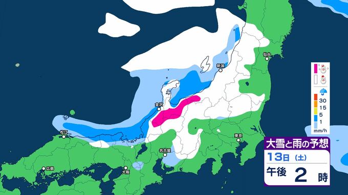 一方、長野県と関東地方北部では、13日午後から14日はじめにかけて、大雪となる見込みです。積雪や路面の凍結による交通障害に警戒・注意し、着雪やなだれにも注意が必要です。