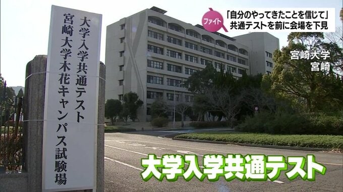 13日から始まる大学入学共通テストを前に多くの受験生が、12日、試験会場の下見に訪れました。受験生たちに試験に向けての意気込みを聞きました。13日から始まる全国一斉の大学入学共通テスト。県内では、宮崎大学…