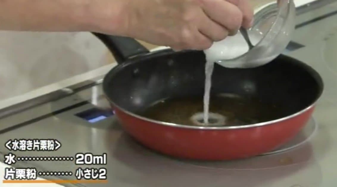 7.残ったタレに少しずつ水溶き片栗粉を入れ、好みのとろみ加減になったらごま油を入れる。