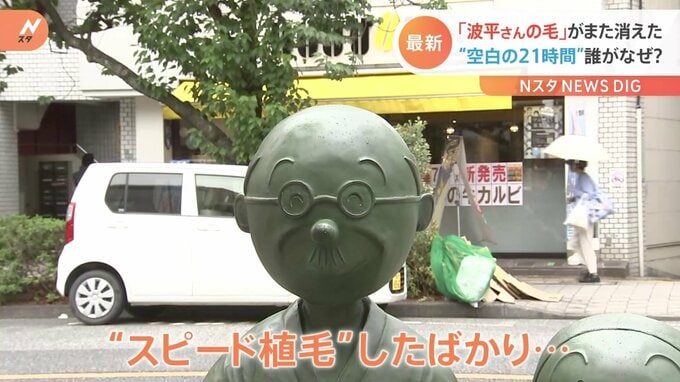 東京・桜新町に設置された波平さんの銅像。これまで6回、髪の毛が抜かれる被害があり、6月に“スピード植毛”されたばかりですが、またしても髪の毛がなくなっていました。これで7度目です。「サザエさん」の街と…