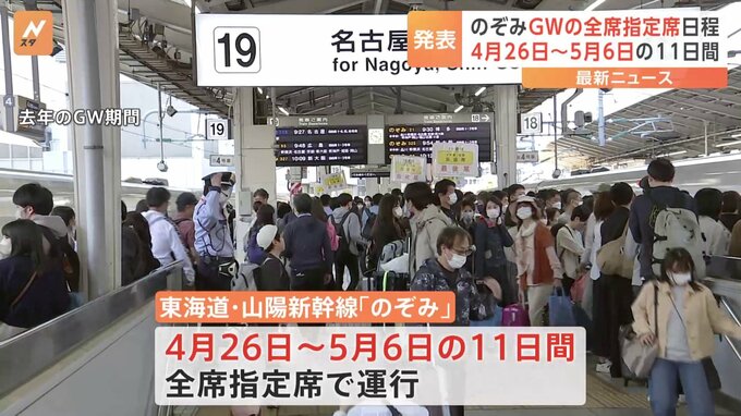 東海道・山陽新幹線の「のぞみ」の今年のゴールデンウィーク期間の全席指定席での運行について、きょう、その実施期間が発表されました。JR東海と西日本によりますと、「のぞみ」を全席指定席で運行するのは4月26…