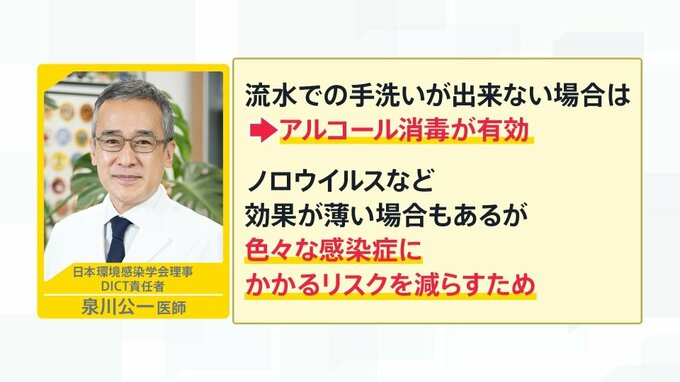 泉川医師によりますと、流水での手洗いができない場合、アルコール消毒が有効だということです。ノロウイルスなど効果が薄い場合もありますが、色々な感染症にかかるリスクを減らすためにもアルコール消毒が有効だといいます。