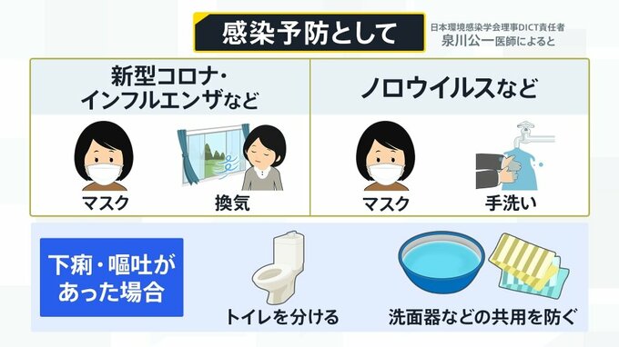 また、ノロウイルスなどに対してはマスクの着用、流水による手洗いが有効だということです。下痢や嘔吐があった場合はトイレを分け、洗面器などを使い回さないといった対策も有効だということです。