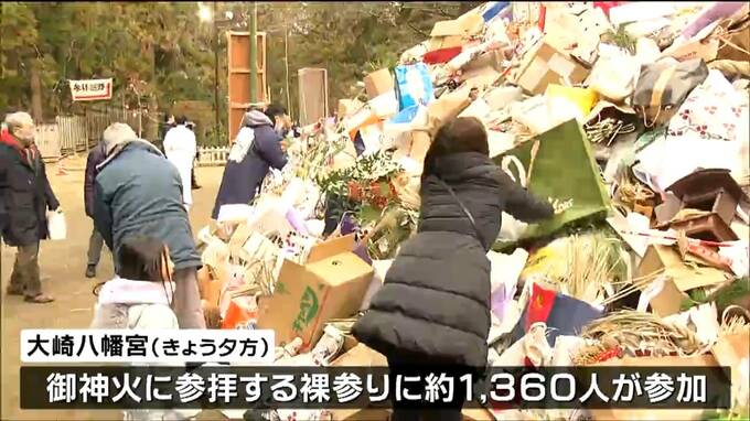 14日夕方、正月飾りを焼く御神がともされます。この御神火に参拝する裸参りにはおよそ1360人が参加します。