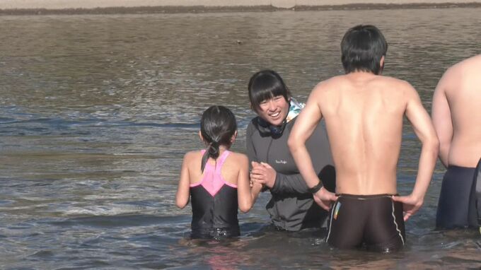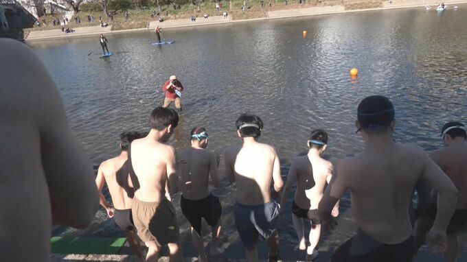 愛知県岡崎市の乙川では、寒さを吹き飛ばそうと寒中水泳が行われました。