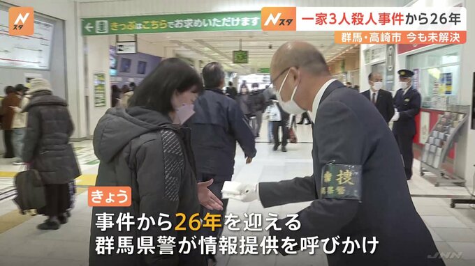 26年前のきょう、現在の群馬県高崎市内の住宅で一家3人が殺害される事件があり、いまも未解決のままとなっていることから、警察が情報提供を呼びかけました。この事件は、1998年1月14日、当時の群馬県群馬町、現在…