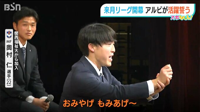 【新加入 奥村仁 選手】「すみません、これつまらないものですけど、おみやげもみあげ~」
