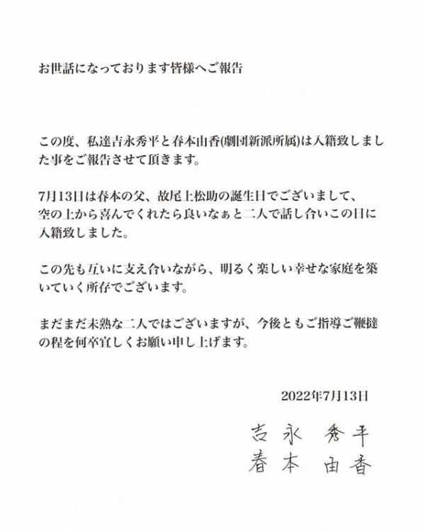 この度、私達吉永秀平と春本由香 (劇団新派所属)は入籍致しました事をご報告させて頂きます。