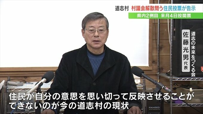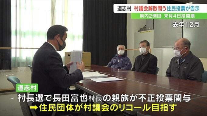 道志村は3年前の村長選で長田富也村長の親族が不正投票に関与したことを受け、住民団体が村長派が多数を占める村議会の解散を目指し活動しています。