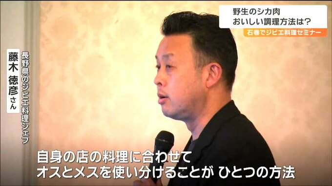 石巻市で開かれたセミナーでは、ニホンジカの肉を使った和・洋・中の4品が用意され、飲食店の店主らおよそ70人が試食しました。調理したのは、ジビエの普及に努める長野県のシェフ、藤木徳彦さんです。藤木さんは「野生のシカやイノシシの肉はメスの方が柔らかい」と話し、肉質を見極めることをアドバイスしました。