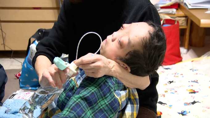 友喜さんは退院後、何度かの手術を経て、10歳で気管切開した。それまでは入退院を繰り返していたが、その後少しづつ安定した。日中は自発呼吸しているが、夜間は人工呼吸器を装着している。また、胃に穴をあけて(胃ろう)直接栄養を届けている。午前5時、午前11時、午後5時、午後11時の1日4回。1回に2時間程度かかるため、夜は由美さん、早朝は学さんが担当している。たんの吸引など医療的ケアが欠かせず、ゆっくり寝ることはできない。睡眠不足のはずなのに由美さんの表情は、穏やかだ。