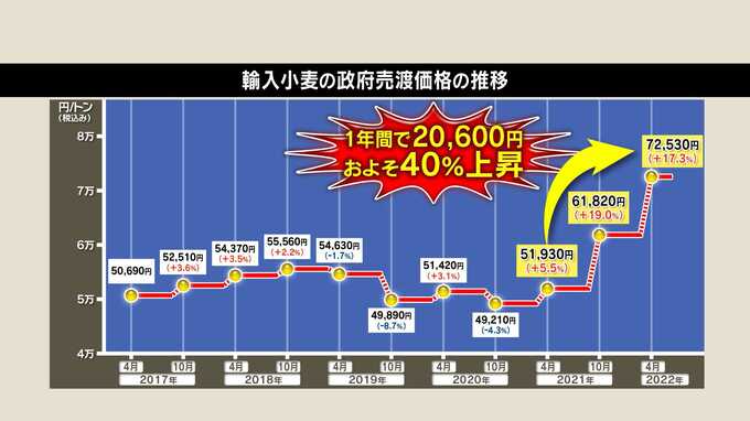 小麦1トンあたりの価格は、去年4月には、5万1930円でしたが、去年10月には、6万1820円に上昇し、さらに今年4月には7万2530円にはね上がるなどこの1年間で2万600円、約40%も上がっています。