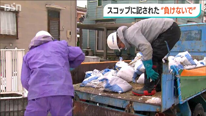 雪が降る中、土のうの積み込み作業が行われていました。