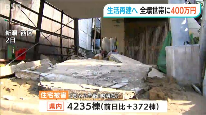 能登半島地震で被害を受けた新潟市に『被災者生活再建支援法』が適用され、住宅が全壊した被災者に最大400万円が支給されることになりました。新潟市以外の自治体の被災者には、県と市町村の事業で同額を支援します。