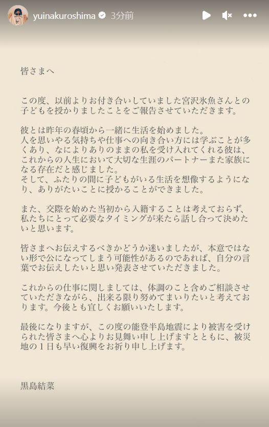 16日、俳優の黒島結菜さんはインスタグラムのストーリーズを更新し、宮沢氷魚さんとの間に第一子を妊娠したことを書面で報告しました。