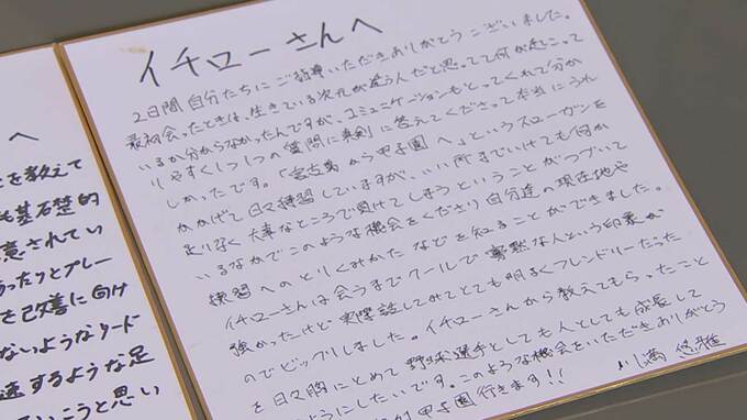 イチロー氏(50、マリナーズ会長付特別補佐兼インストラクター)による高校球児指導が離島から「悲願の甲子園出場」を狙う沖縄・宮古島の宮古高校12月16、17日の2日間に渡り行われた。その指導内容・真意を振り返ってもらうインタビュー取材に先駆けて、イチロー氏が大事に抱え、見せてくれたのが宮古高校野球部員一人一人から贈られた感謝のメッセージが書き込まれた色紙だった。