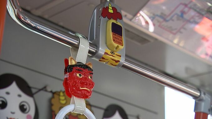 「岡山の鬼伝説」にちなんで車内でも可愛らしい鬼たちが利用客を出迎えます。