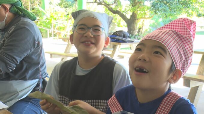 石垣青少年の家が毎年この時期に行っている「カーサムーチーづくり」には、親子など12人が参加し、もち粉と砂糖のみのシンプルな白ムーチーと、紅芋ムーチーの2種類を作りました。