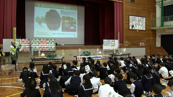 子どもたちに香川県産の農産物・畜産物に親しんでもらおうと、生産者による食育の出前授業が、香川県宇多津町の小学校で行われました。