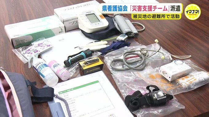 出発を前に、生活用品をはじめ、血圧計や聴診器・消毒薬など、持ち物を一つずつ確認していました。1チーム2人で行動し、被災地には4日間滞在する予定です。