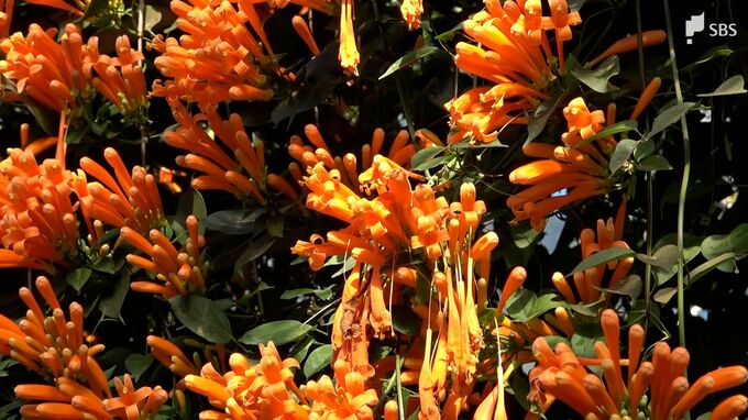 静岡県東伊豆町の熱川バナナワニ園では、鮮やかなオレンジ色の花を咲かせるカエンカズラが満開になり、来場者の目を楽しませています。