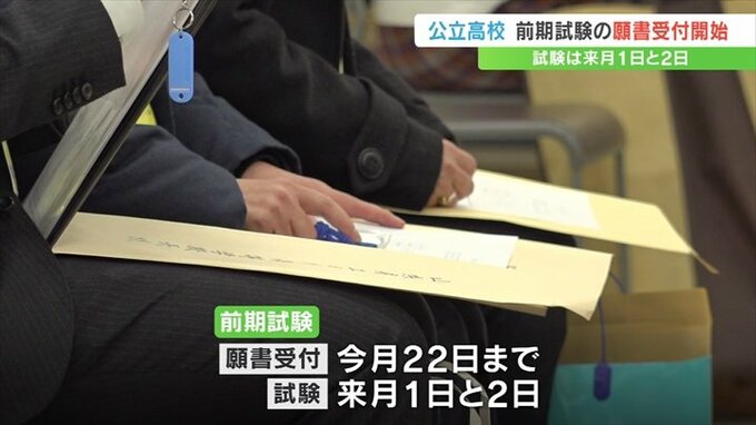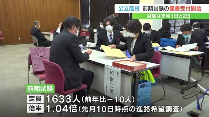 今年の前期試験の全体の定員は去年より10人少ない1633人で、中学3年生を対象にした去年12月10日時点の進路希望調査では、倍率は去年より0.02ポイント高い1.04倍となっていました。