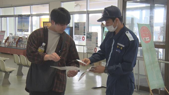 石垣海上保安部などは、1月18日に石垣港の離島ターミナルに立つ具志堅用高さんの銅像に「海のもしもは118番」と書かれたライフジャケットを掛け、利用客らに118番の正しい利用を呼びかけました。