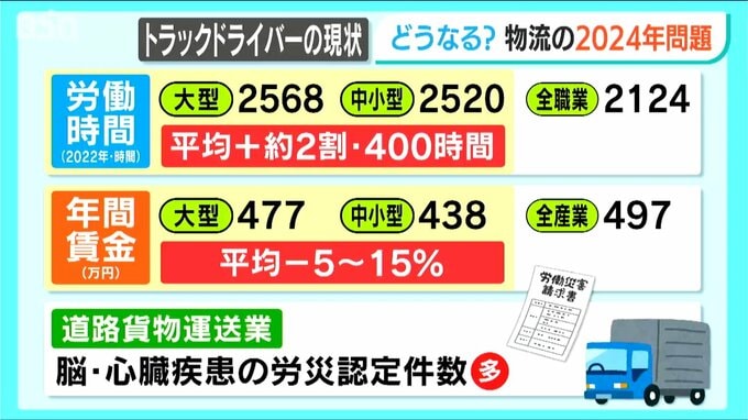 厚労省の調べでは、トラックドライバーの労働時間は全職業の平均と比べておよそ2割、400時間ほど長くなっています。その一方、賃金は平均よりも5%から15%ほど低く、さらに道路貨物運送業は、他の業種に比べて脳や心臓疾患の労災認定件数が突出して多いという問題もあります。