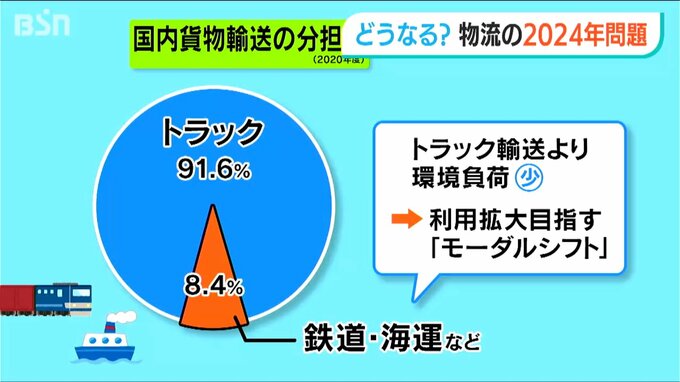 こうした中、CO2排出量の削減という面からも、トラック以外の輸送方法に注目が集まっています。国内の貨物輸送を重量ベースでみるとおよそ9割をトラック輸送が担っています。現在1割に満たない船舶や鉄道の輸送ですが、トラック輸送よりも環境負荷が少ないとされていて、その利用拡大を目指す「モーダルシフト」に期待が高まっているのです。