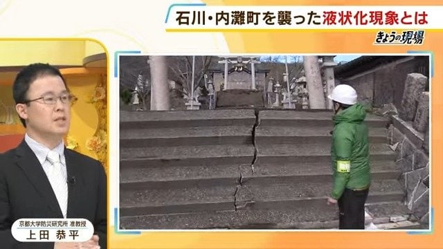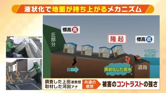 (京都大学防災研究所 上田恭平准教授)液状化が発生したところは、やはり全ての条件が揃っていると考えていいと思います。内灘町の地形が関係しているんですね。土地が砂丘で、砂丘自体にそれほど液状化リスクはないんですが、砂丘から低地に向かって、低地に向かうところは地下水位が基本的に高くなりやすいです。なおかつ、砂でできた地盤だったことが、かなり液状化の要因にはなっていると思います。
