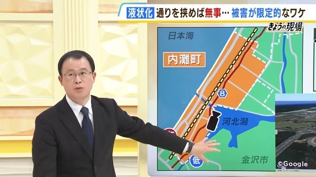 ――県道8号の東側は干拓地で元々、河北潟だったものを昭和40年ごろ埋め立てています。水分は多いのですが、そちらはあまり被害が出なかった。上田准教授によりますと、「低地との境目であることと、沿岸部や水辺が近い場所は、浅いところに地下水がある」など、液状化しやすい条件が重なったということです。