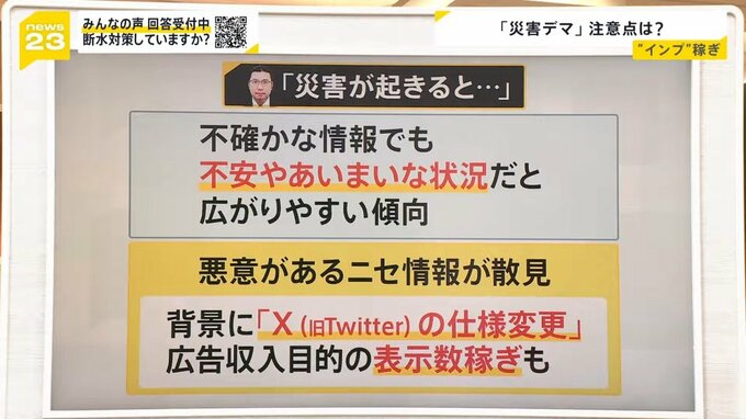 背景には何があるのかというと、X(旧Twitter)が仕様変更されましたよね。広告収入目的の表示数稼ぎもあるのではないかと、木村教授は指摘をしているということです。