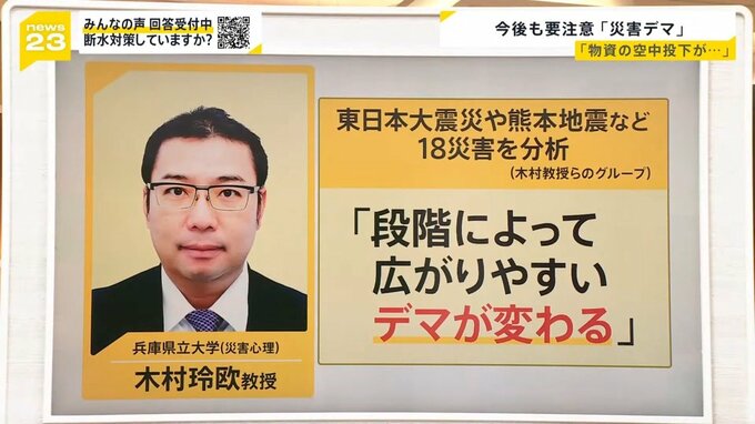災害心理が専門の兵庫県立大学の木村玲欧教授らのグループが、過去の災害を分析したところ、「段階によって広がりやすいデマが変わる」ということがわかってきているんです。順を追ってみていきます。