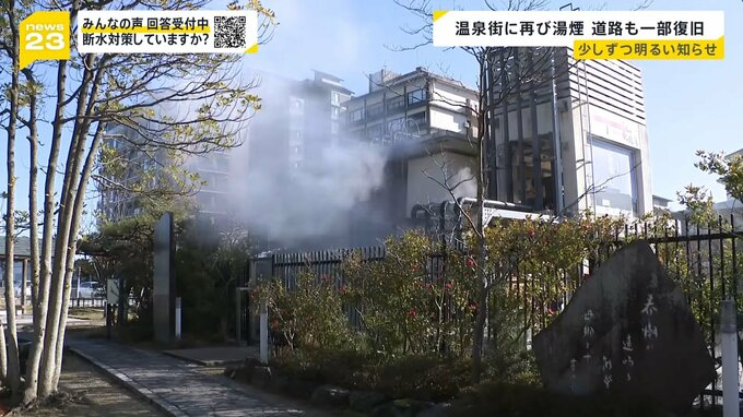 温泉を旅館に送り出すことはまだ出来ませんが、温泉街は再び湯煙に包まれました。道路の復旧も少しずつ進んでいます。