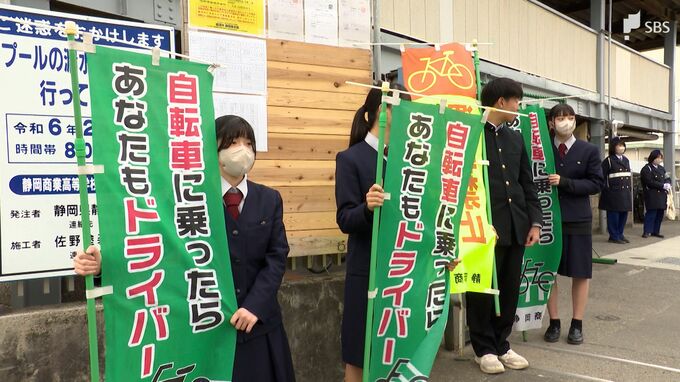 19日朝、静岡市葵区の静岡商業高校では警察官や教員、生徒ら36人が、自転車で通学する生徒に対して、一時停止などの交通ルールやヘルメットの着用を呼びかけました。