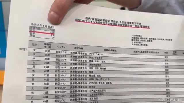 「新型コロナウイルス感染症予防接種健康被害審査第一部会審議結果」。2024年1月15日、審議件数が今回は160件あり、認定が129件で多い方です。否認が29件となっています。保留は2件。