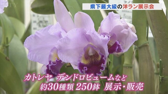 41回目となる今年はカトレヤやデンドロビュームなどおよそ30種類250鉢が展示販売されています。