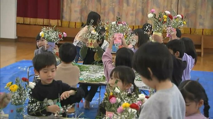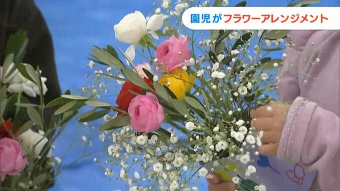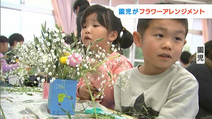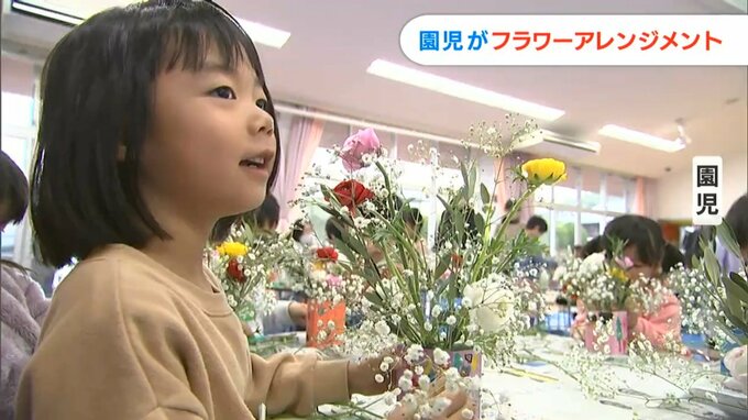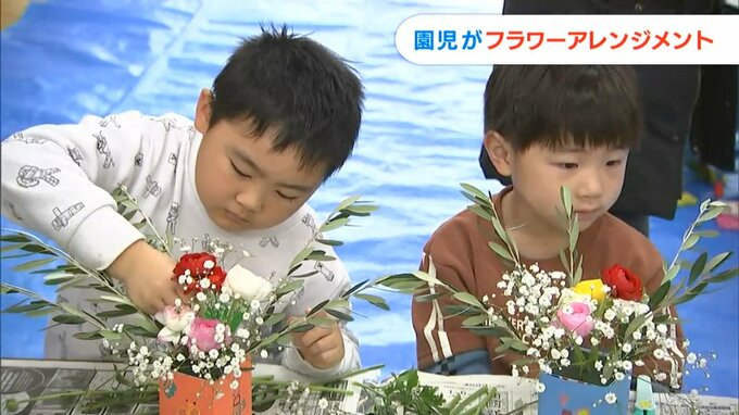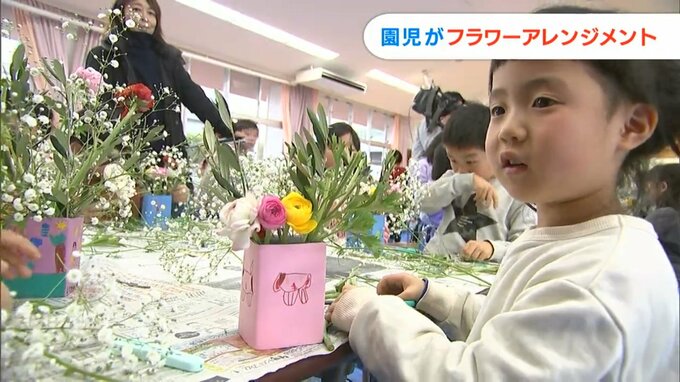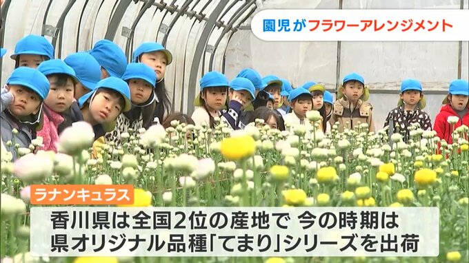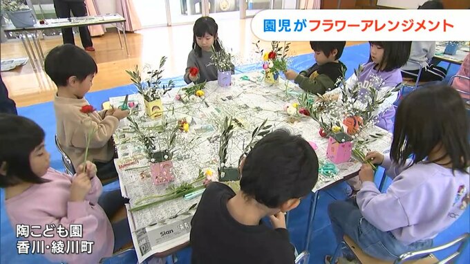 綾川町のこども園では昨年からこのシリーズを使ったフラワーアレンジメントを行っていて、園児約40人が色とりどりのラナンキュラスを、オリーブやカスミソウと一緒に挿して作品を完成させました。