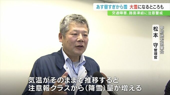 気象台は気温が低く降雪が強まると大雪警報を発表する可能性があるとしていて、交通障害や路面の凍結に注意・警戒を農業施設の倒壊に注意を呼び掛けています。