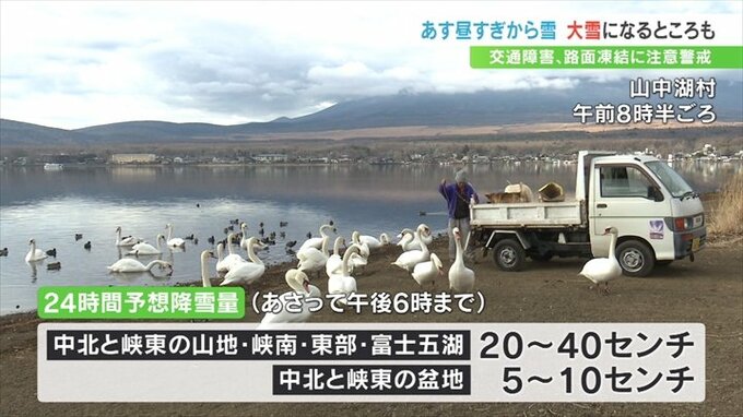 雪は20日の夜からがピークとなる見込みで、21日午後6時までに予想される24時間降雪量は多いところで中北と峡東の山地、峡南、東部、富士五湖で、20~40cm、中北と峡東の盆地で5~10cmとなっています。
