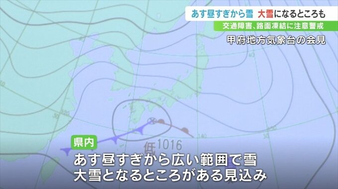 甲府地方気象台によりますと、前線を伴った低気圧が本州の南岸を発達しながら東へ進むため、20日の昼すぎから県内の広い範囲で雪が降り、大雪となるところがある見込みです。