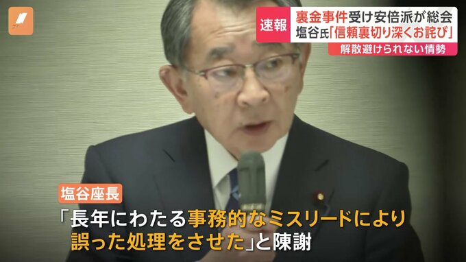 自民党の派閥の政治資金問題をめぐる事件を受け、先ほどから安倍派が臨時総会を行っています。塩谷座長は「信頼を裏切り、深くお詫びを申し上げる」と陳謝しました。自民党本部から中継です。午後6時から始まった…