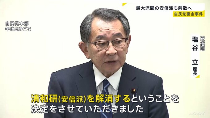 自民党の最大派閥・安倍派は今夜、臨時総会を開き、裏金事件で3人の議員が立件されたことなどを受け、派閥の解散を決めました。安倍派 塩谷 立 座長「清和研(安倍派)を解消するということを決定をさせていた…