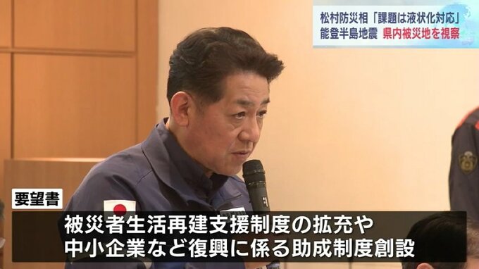 能登半島地震で家屋が破損した富山・氷見市などを松村祥史防災担当大臣が20日に視察し、今後は液状化への対応が重要課題の一つであるとの認識を示しました。