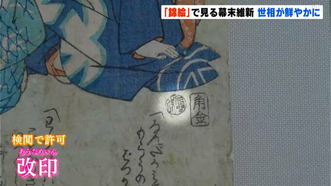 また、当時の幕府には出版物を検閲する機関があり、風刺している錦絵でも検閲で許可された「改印」(あらためいん)が押されているものがある一方、許可印が押されていない“非合法”のものも数多く出回っていて、人々の目に映った“幕末の姿”が読み取れます。