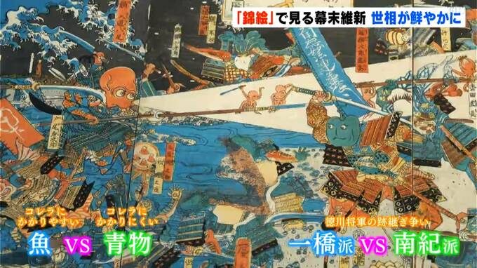 こちらの絵では、当時流行した「コレラ」を題材に、「コレラにかかりやすい魚」と「かかりにくい青物野菜類」が戦っていますが、「一橋派と南紀派による徳川将軍の跡継ぎ争い」の様子も風刺されています。