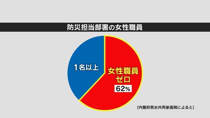 避難所生活では、トイレや着替え、女性用の物資不足のほか、性犯罪なども大きな問題となりました。全国各地で災害が相次ぐ中、避難所運営にも女性の視点が必要とされていますが、内閣府のデータによると、日本の約6割の自治体は防災担当に女性職員がいません。